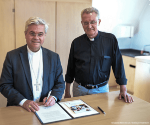 Noch bevor die Paderborner Domglocken die Heilige Messe einläuten, hat Erzbischof Dr. Udo Markus Bentz schon „Zukunftsgeschichte“ geschrieben. Mit seiner Unterschrift setzt er das neue „Leitbild der katholischen Schulen in Trägerschaft des Erzbistums Paderborn“ in Kraft. Das neue Leitbild soll eine gemeinsame Ausrichtung und verbindliche Orientierungsgrundlage für die Schulen setzen. Im Fokus steht dabei weiterhin, die offene Haltung für die Auseinandersetzung und Begegnung mit Gott, unter anderem in Form von Schulgottesdiensten, Gebeten und der Sichtbarkeit des Kirchenjahres innerhalb des Schullebens. Ein Bewusstsein soll darüber hinaus geschaffen werden für ein respektvolles und wertschätzendes Miteinander, für den Dialog mit anderen Konfessionen, für den Wert der Schöpfung, für die Weltkirche und für die Unterstützung benachteiligter Gruppen. Auch das „Leben und Lernen in der digitalen Welt“ und damit der gesunde Umgang mit Medien erfährt im neuen Leitbild besondere Bedeutung. Gemeinsam mit dem Leiter des Bereichs Schule und Hochschule, Dompropst Monsignore Joachim Göbel, überreicht Erzbischof Dr. Udo Markus Bentz den Schulleiterinnen und Schulleitern der versammelten Schulen das neue Leitbild: https://schule-hochschule.wir-erzbistum-paderborn.de/kath-schulen/schulen-des-erzbistums/leitbild/inhalt-leitbild/
