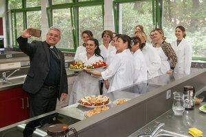 „Krokodile“ für den Kindergeburtstag: Erzbischof Dr. Udo Markus Bentz macht ein Selfie mit den Schülerinnen in der Lehrküche.