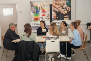 Bei Rundgängen durch die Schule besuchte Bentz die verschiedenen Ausbildungsbereiche von der Lehrküche, in dem ihm besonders der Pflaumenkuchen mit Sahne mundete, bis hin zu einer Speed-Datingrunde mit vier verschiedenen Gruppen aus den Bereichen Heilerziehungspflege, Kinderpflege, Sozialassistenz, (Fach-)Abitur. Hier beeindruckte ihn besonders, dass die Schülerinnen hier viel Selbstwirksamkeit erleben. „Nach schwierigen Erfahrungen an meiner letzten Schule habe ich hier neues Vertrauen in mich selbst bekommen“, äußerte sich ein Schüler sehr offen über seine Biografie. Von diesen Formen der Ermutigung konnten auch weitere Schülerinnen berichten.